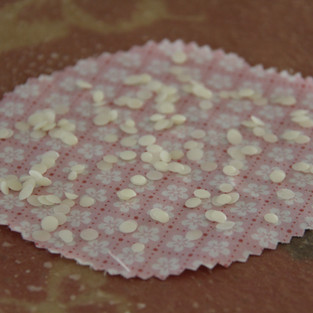 4. Bienenwachs-Granulat oder Wachsstückchen von 100% Bienenwachskerzen darauf verteilen 5. Backtrennpapier darüber legen 6. Bügeln; dabei von innen nach aussen fahren, damit auch die Ecken mit Wachs bedeckt werden